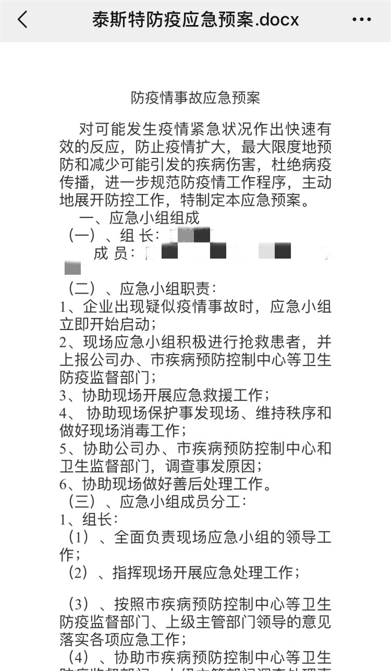 (1)泰斯特公司制定復工生產(chǎn)實施方案、應急方案、疫情防控工作方案等,確保嚴格落實、全面防控。